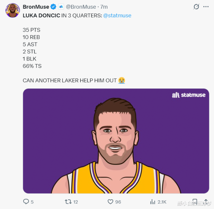 第三节湖人是崩盘的一节,可这一节全队25分有13分是东契奇一人所得,单节9中6拿13分3篮板1助攻1抢断,三节打完已经拿到35+10+5的数据。