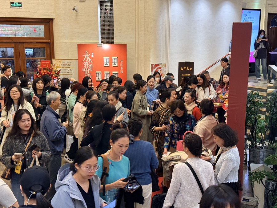 签到墙上留言贴纸被围出“800”字样,一字一句满是深情;盖章点前观众们排起长队,只为留下“今日份”的特殊纪念。二楼的道具服装展示区前队伍更长,李侠的长衫、兰芬的旗袍静静陈列,黄包车停在一旁,每一件物品都在喧闹的人潮中默默讲述着作品台前幕后的动人细节。